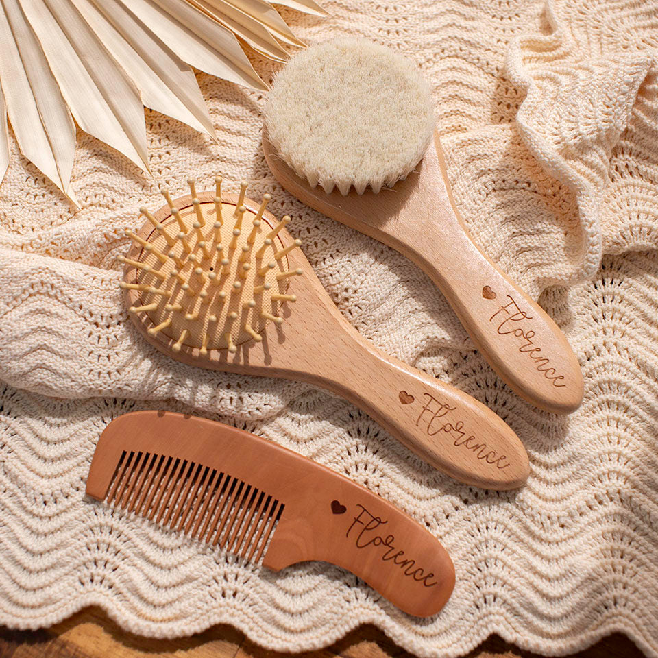 A beautiful personalised set of 2 x brushes and 1 x comb, suitable from birth, making the most perfect and unique gift or keepsake.