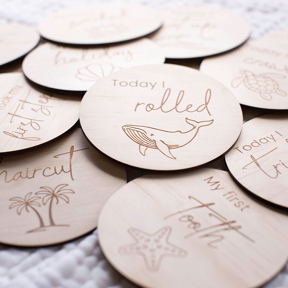 Capture every milestone of your little one’s journey with our beautifully crafted Ocean Achievement Milestone Discs! This serene set of 16 wooden discs celebrates your baby’s most precious moments, from ‘Today I said my first word’ to ‘My First Christmas’ and everything in between. Featuring coastal-inspired designs like seashells, palm trees, sunsets, turtles, and dolphins, these discs are perfect for creating those dreamy, Insta-worthy photos while adding a relaxed seaside touch. Whether it’s their first haircut, their first tooth, or any special moment along the way, these milestone discs help you treasure and share your baby’s big achievements in style.