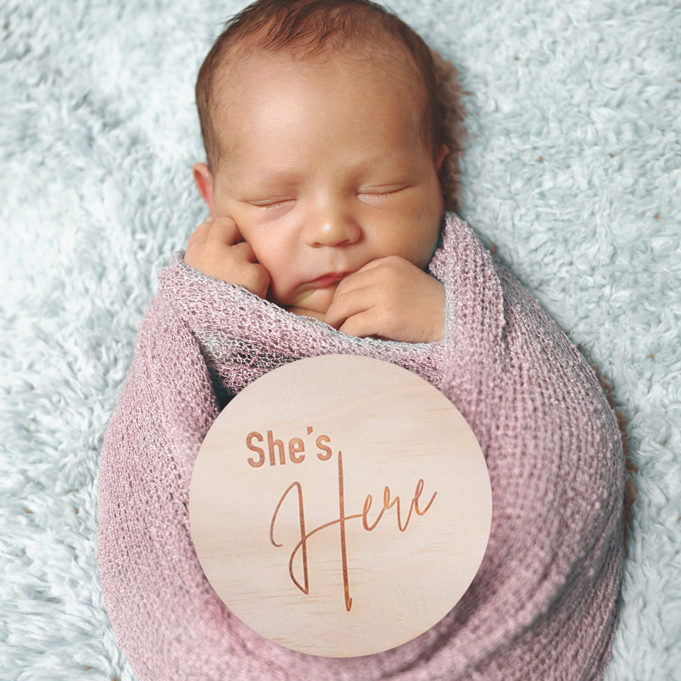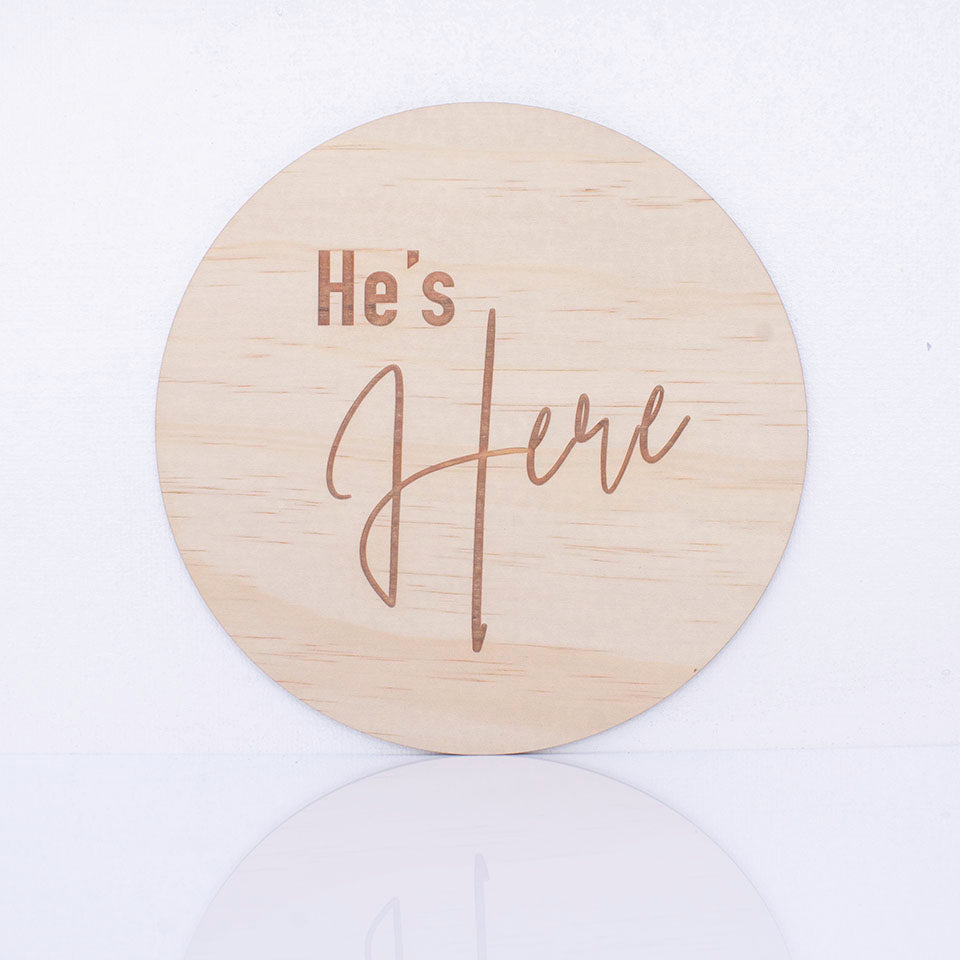 Capture the excitement of welcoming your little one with this elegant, double-sided birth announcement disc. Crafted from smooth, hand-sanded wood, it features a classic, timeless design with “She’s Here” on one side and “He’s Here” on the other, giving you the flexibility to announce your baby’s arrival in style. Measuring approximately 14.5cm in diameter, this beautiful keepsake makes a stunning addition to your announcement photos, nursery décor, and memory displays.