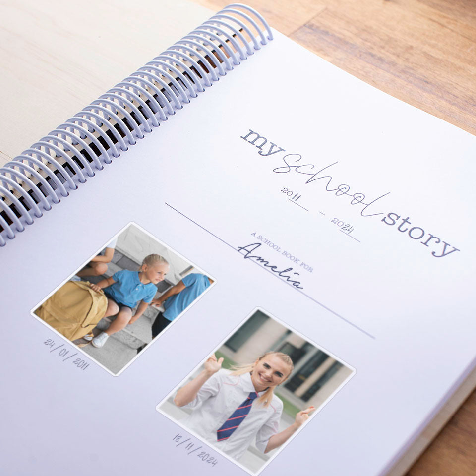 • Plenty of spaces for photos including 2x3", 4x6" or small square photos work really well. There's also space for a 5x7" photo each year. (Please note - whilst our books cannot fit A4 photos due to the coil taking up space, our "My School Story" keepsake box, with internal dimensions of approx. 337mm x 262mm x 70mm, can fit larger photos, making it great option for storing and treasuring most school and class photos).