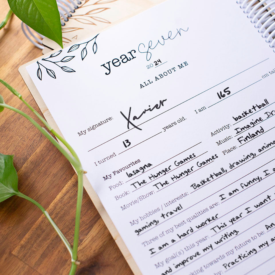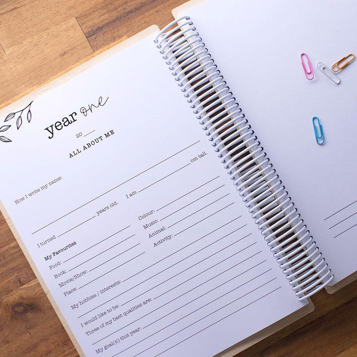 • First year - Year 6: 48 pages from the early years through to year six. The first two early years sections contain blank spaces where you can write the name of the year as these terms can vary depending on your location (eg: kindergarten/kindy, prep/preparatory, transition, reception, pre-school, pre-primary, etc.). Starting from year one, the year names will be printed in the corresponding sections of the book. Each year in this section includes six pages with content such as:
