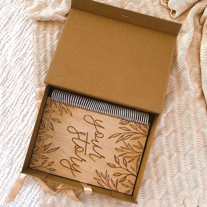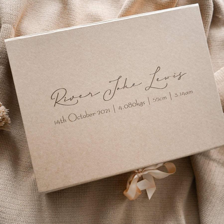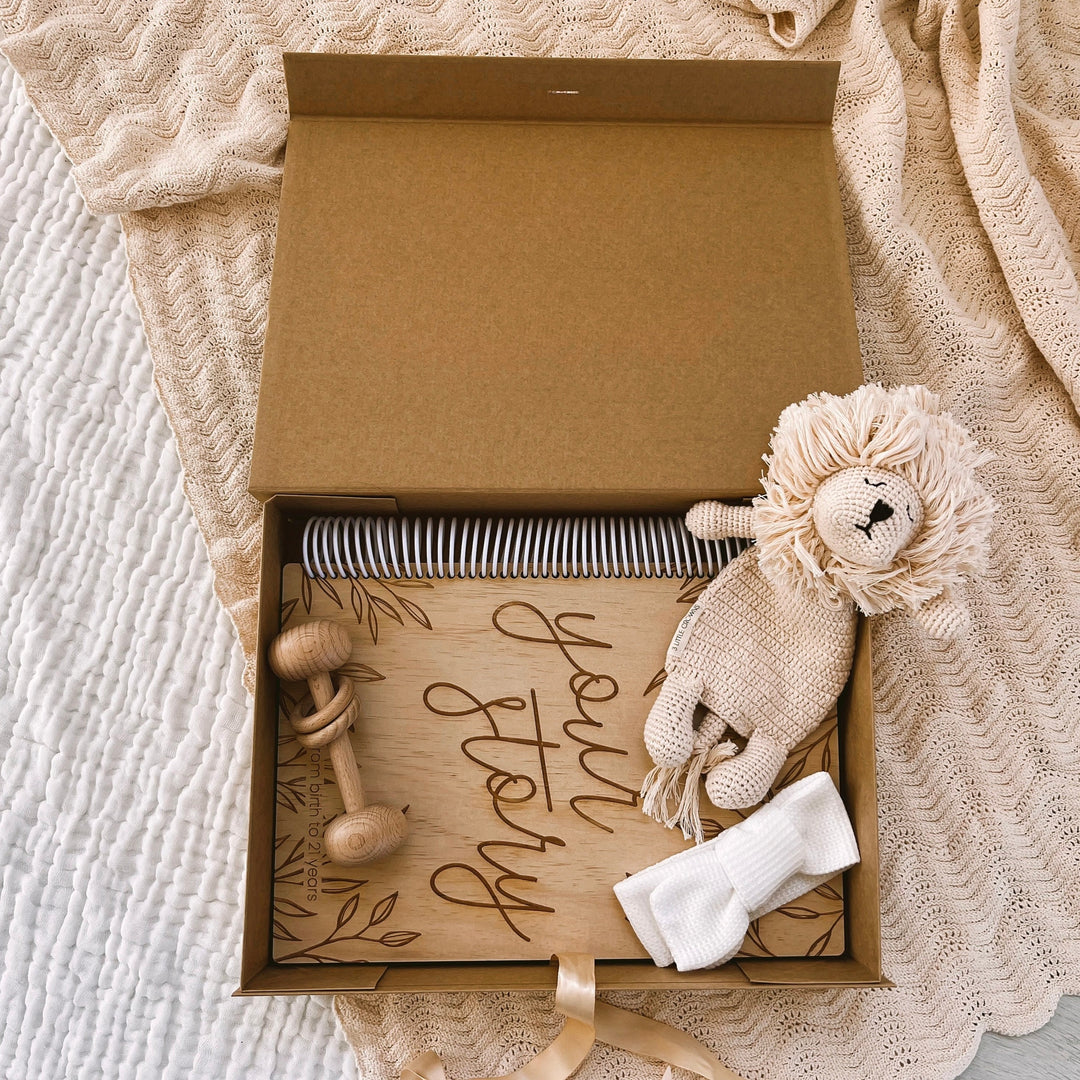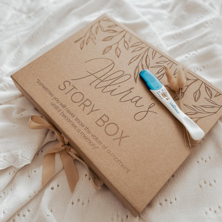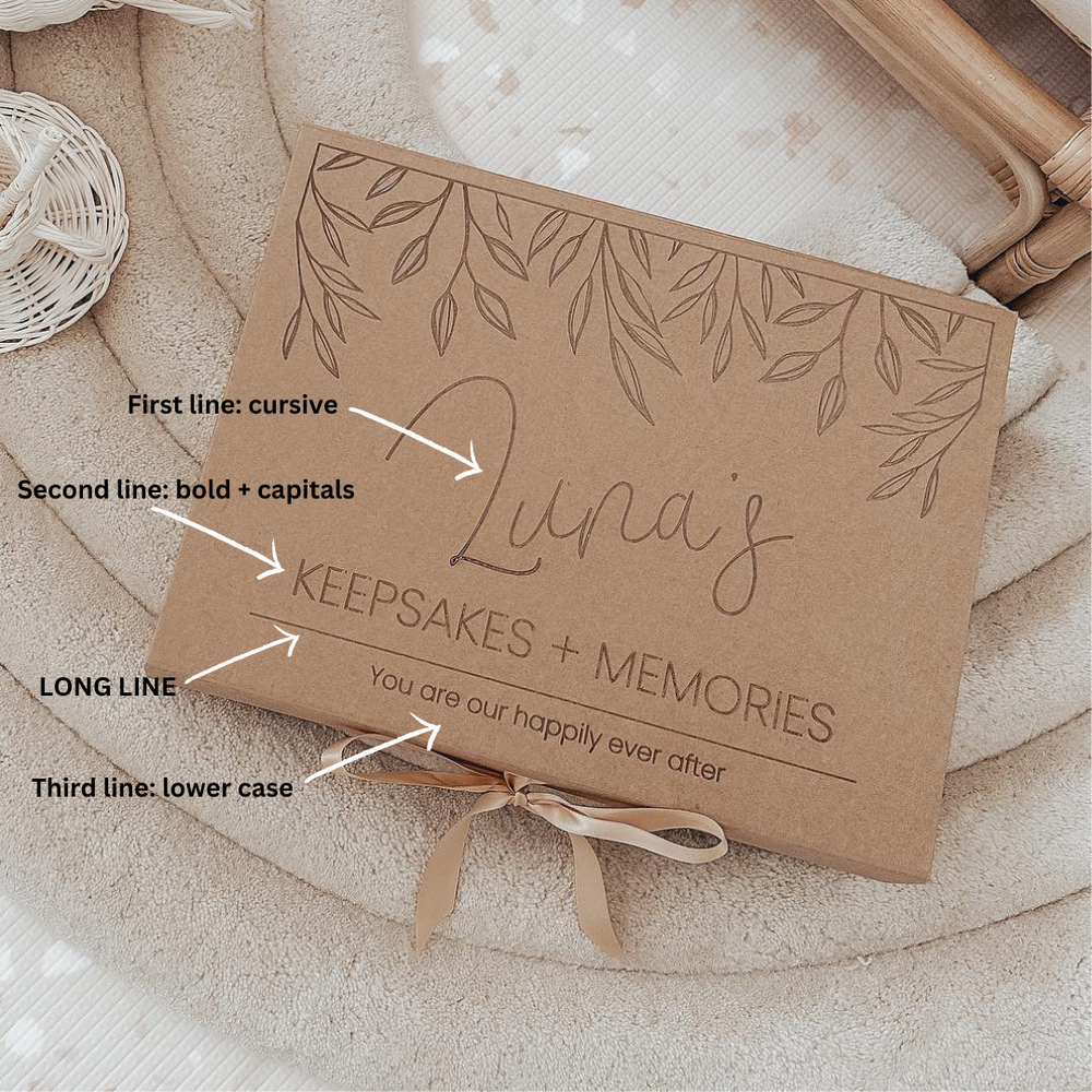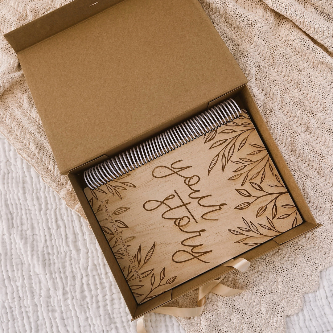Our non-custom "YOUR STORY" vine keepsake boxes are designed to hold our wooden baby book, along with your special keepsake items like birth certificates, birth announcements, first outfits, hospital keepsakes, and other important trinkets. We also offer a custom keepsake box.