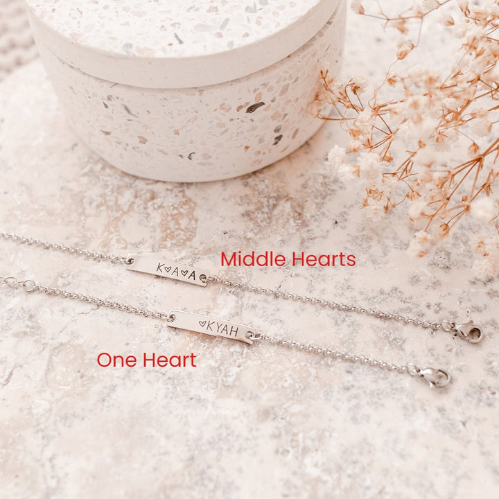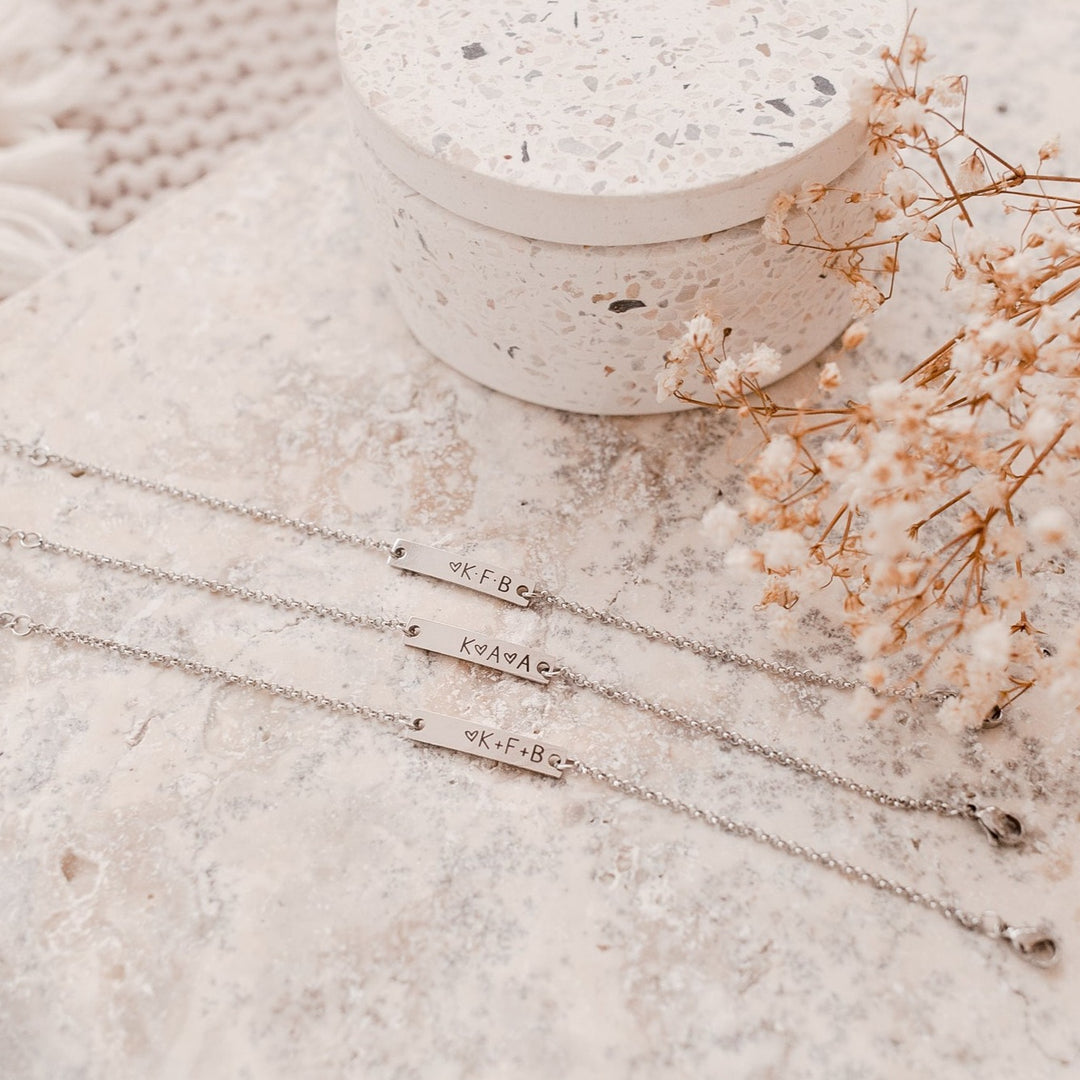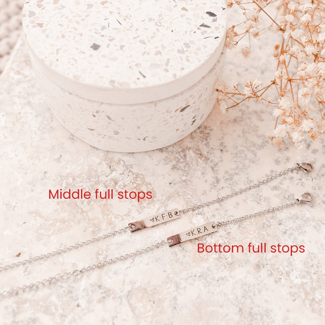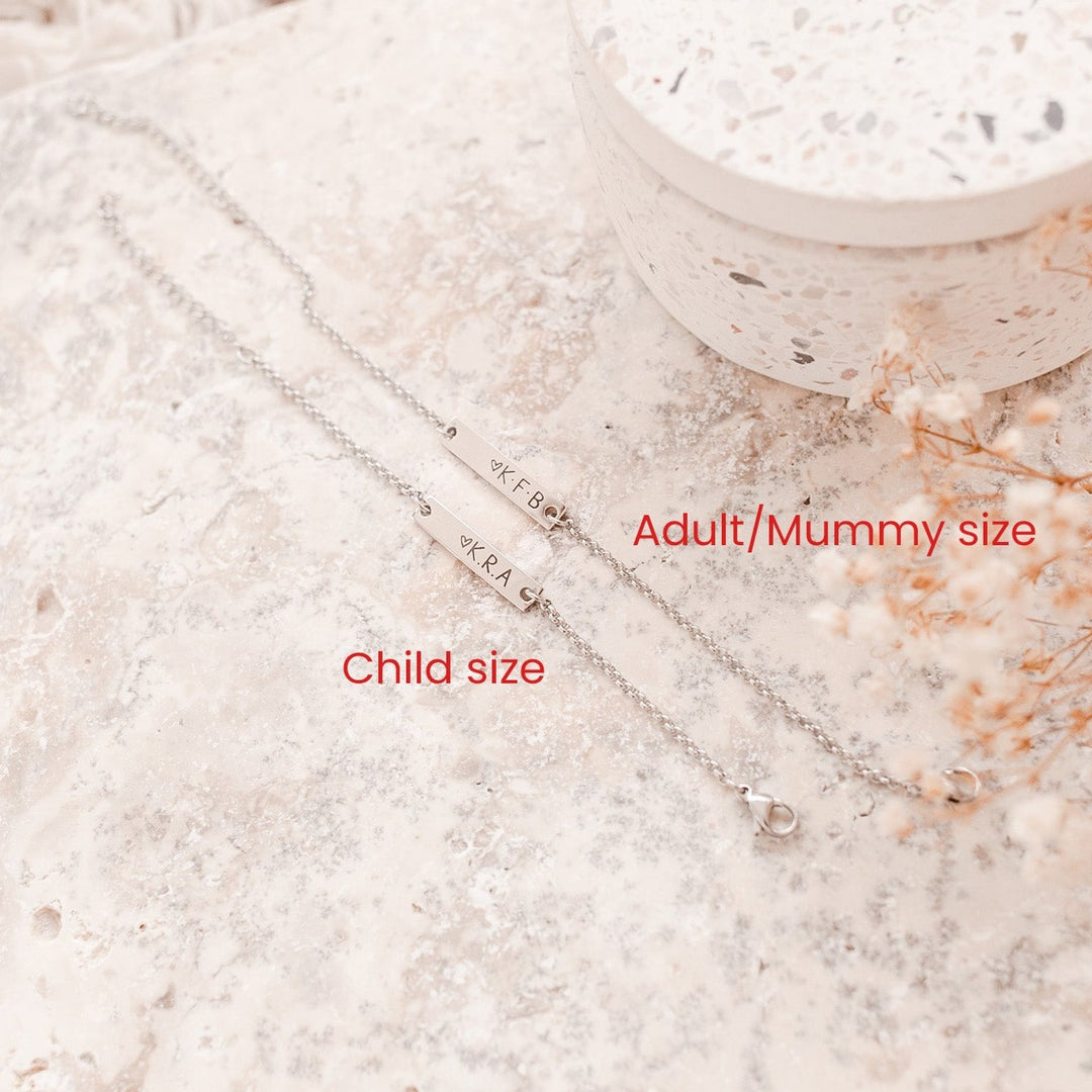 - you can select from 2 or 3 or 4 initials to engrave only. We are unable to offer more than 4 initials. All letters must be capitals in order for them to engrave as crisp and clear as possible--if lowercase letters are provided we will change them to capitals. If your child has only 2/3/4 letters in their first name, we can offer this without the full stops. MUM BRACELETS are designed to have each of your child's first name first letters etch (A mummy of Sophia, Thomas and Lilly will request S + T + L). A child's will be their initials (Sophia Lee Smith will request S.L.S)
