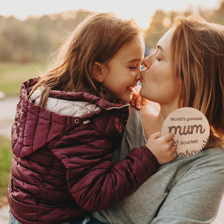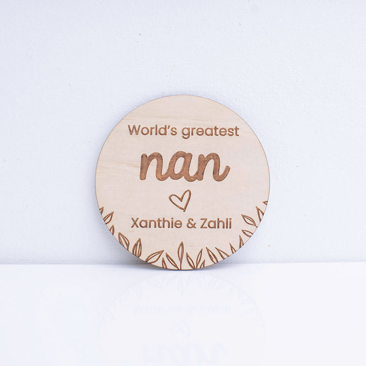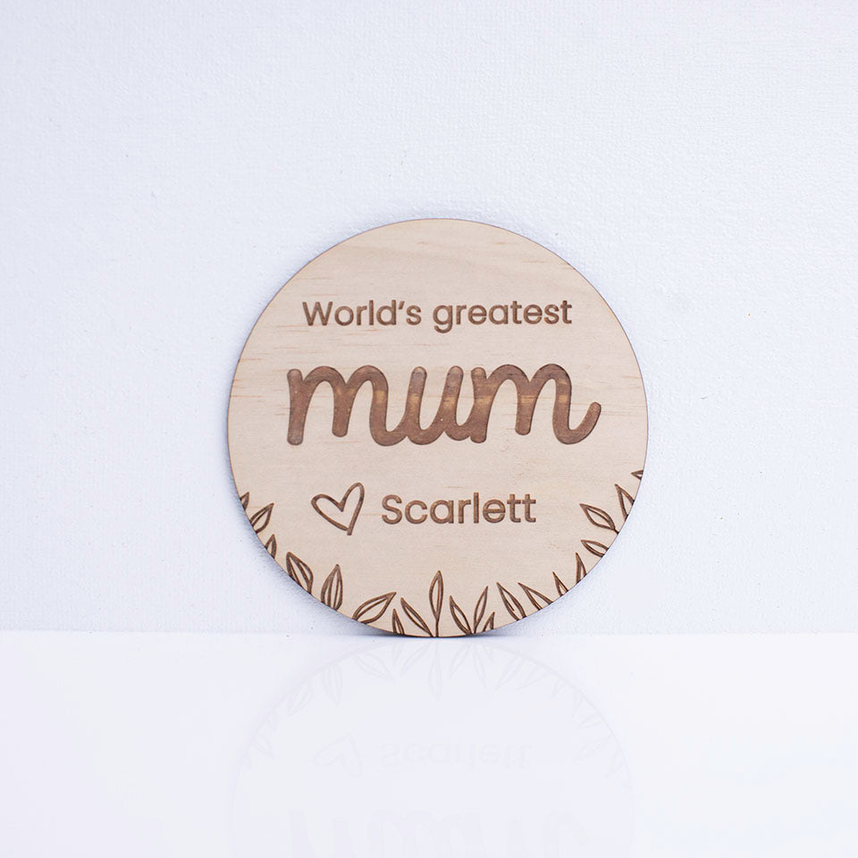 Celebrate a loved one's greatness with these delightful wooden discs! These round plaques feature our classic vine design and the sweet message "World's greatest" with your choice of wording beneath (eg: mum, dad, nan, etc.). Customise your disc with a heart and your child's (or children's) name(s) for an extra special touch. Whether it's from Dad, Mum, or the kids, these plaques make the perfect Mother's Day, Father's Day, or birthday gift. It's a simple yet heartfelt way to show Mum, Dad, Auntie, Uncle, Grandma, or Grandpa just how much they're loved and appreciated.