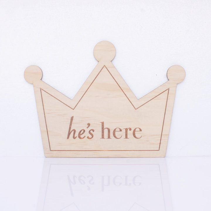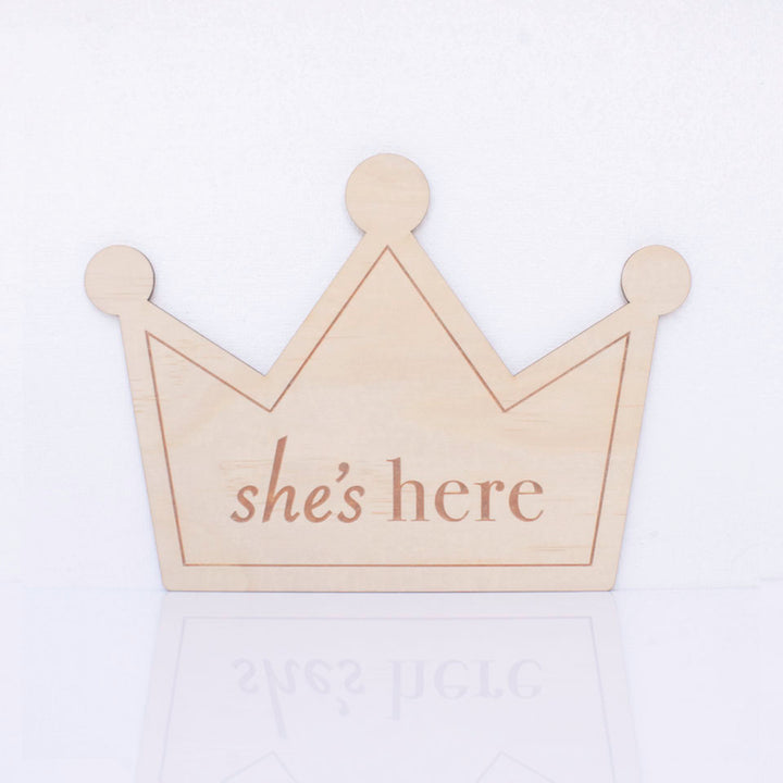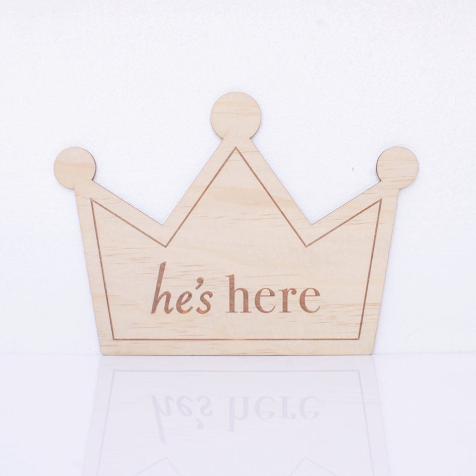 Celebrate the arrival of your little prince or princess with this enchanting, crown-shaped birth announcement plaque. Made from smooth, hand-sanded wood, it’s designed with elegance and charm to announce your baby’s grand debut. One side proudly reads “she’s here,” while the other says “he’s here,” offering flexibility for announcing your little one’s arrival in regal style. This keepsake adds a majestic touch to announcement photos, nursery décor, and cherished memory displays.