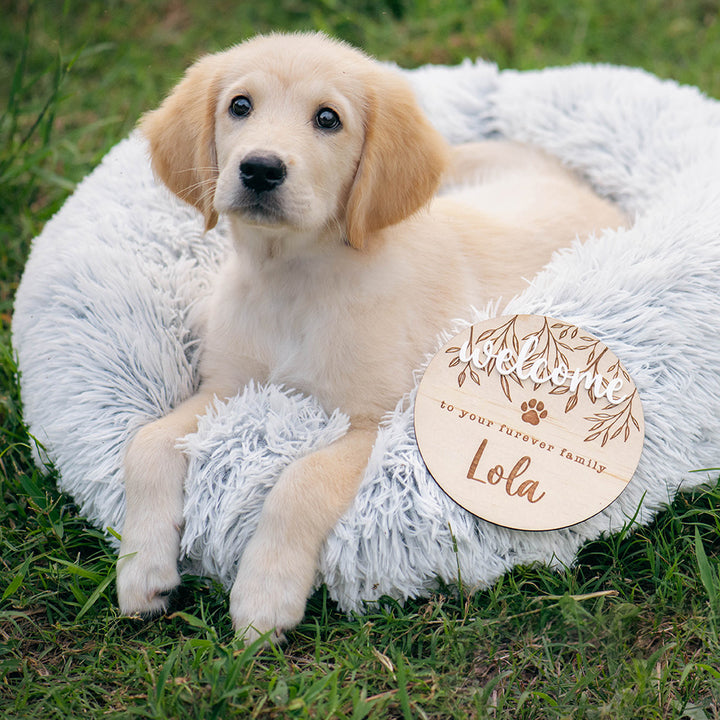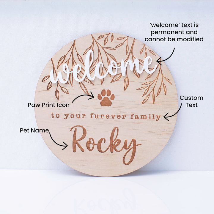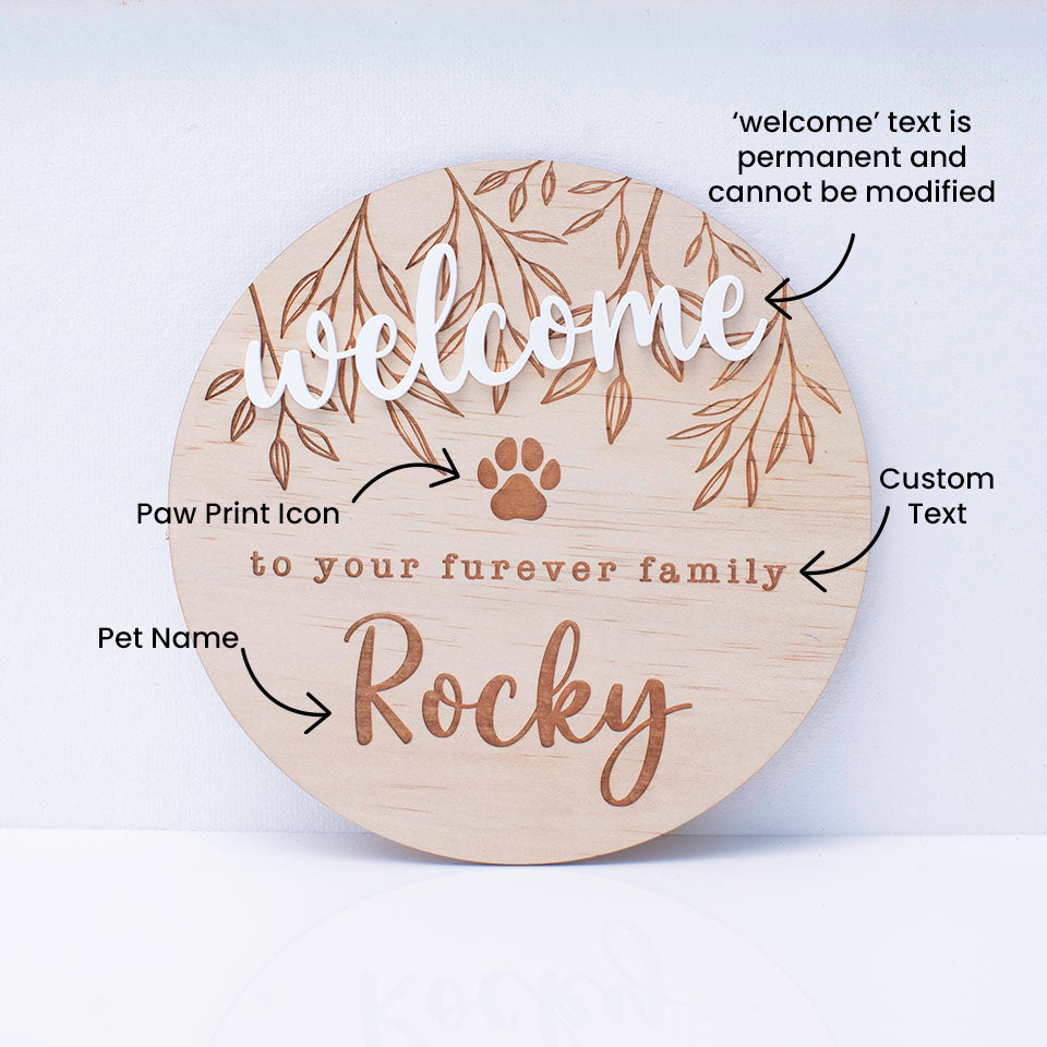 Celebrate the arrival of your newest furry, fluffy, or scaly family member with our charming wooden plaques. Each plaque features the heartwarming message "Welcome to your furever family," beautifully etched alongside your pet's name on the disc. These plaques make great additions to your images, flat lays, or just a perfect way to share the good news of your new dog, cat, puppy, or kitten with friends and family.