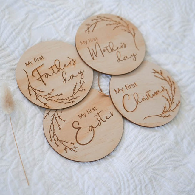 Our calendar special event wooden discs are a lovely add-on to our month milestone cards. We have selected the 4 biggest events of baby's first year!