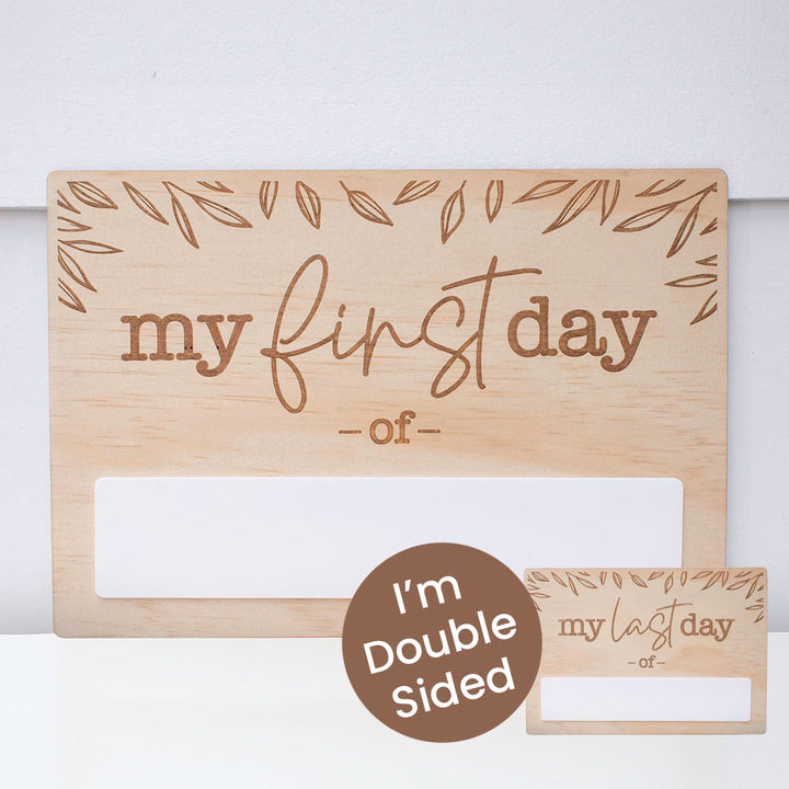 Our boards are designed with beautiful timber and white acrylic materials, etched with our timeless fern design and display the words 'my first day -of-' on one side and 'my last day -of-' on the other side.