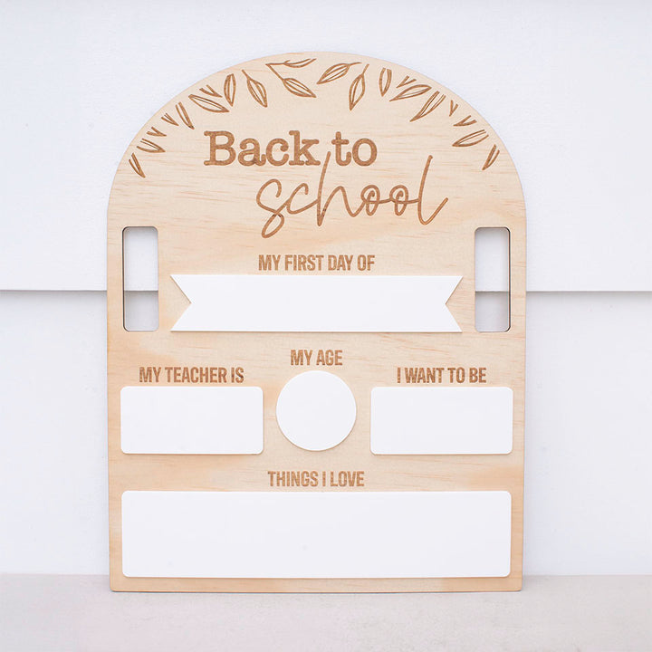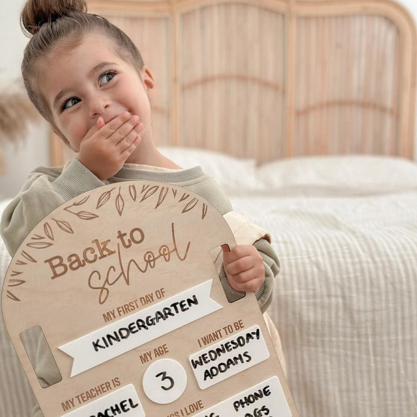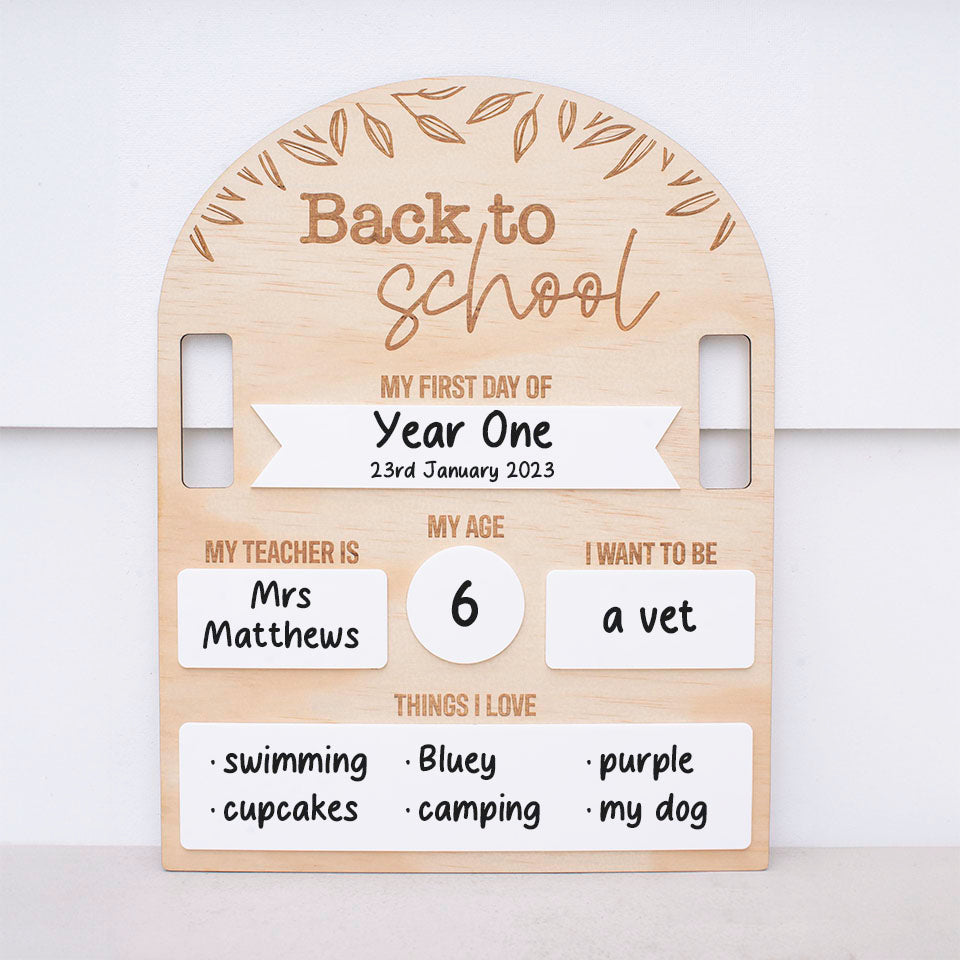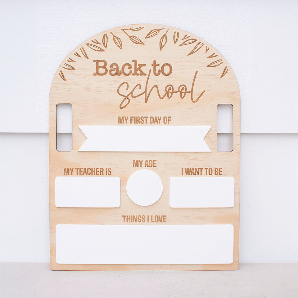 Our school boards are designed on beautiful timber and white acrylic materials with our timeless fern design and come with handles to ensure the 'perfect' shot is captured without little hands getting the way.